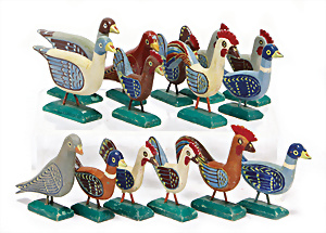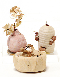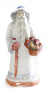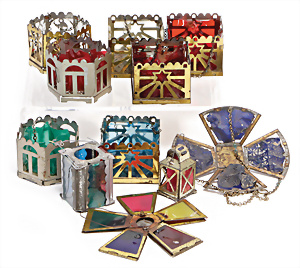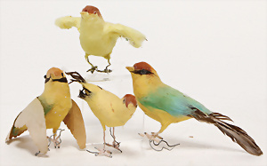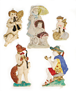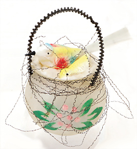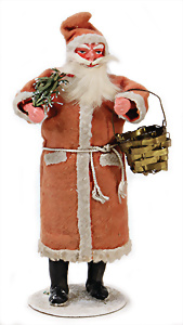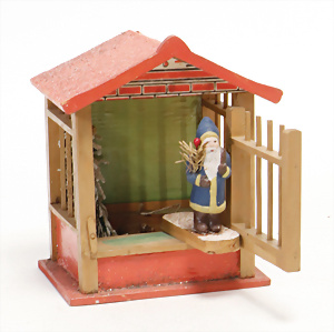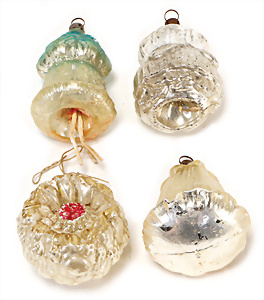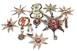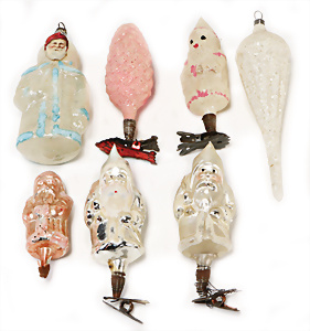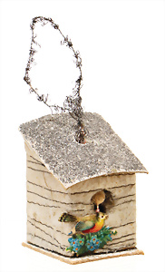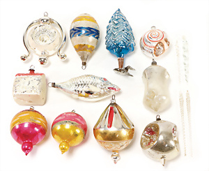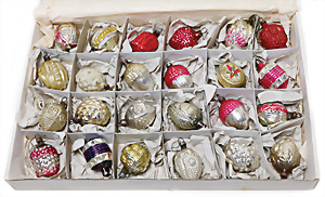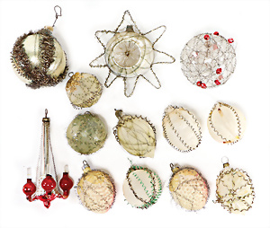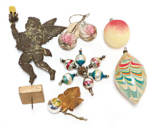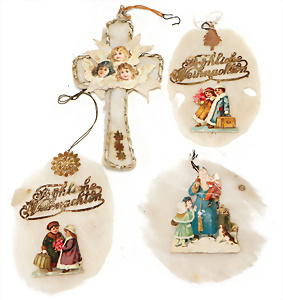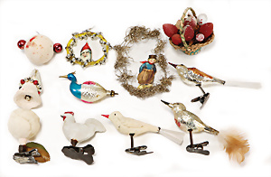 Weihnachtsschmuck, Korb mit Glasfrüchten, Glasblüte, Glimmer, 3 Vögel mit Klammer, Glasring mit Oblaten-Gesicht, 2 Teile Watte, 1 Oblaten-Bild mit Kranz