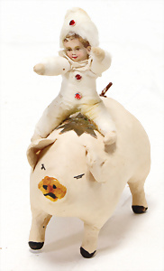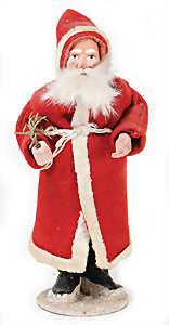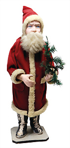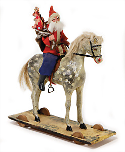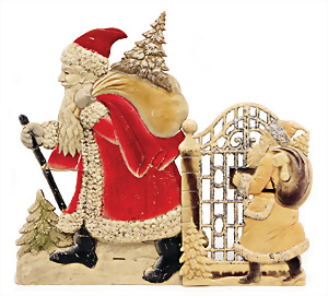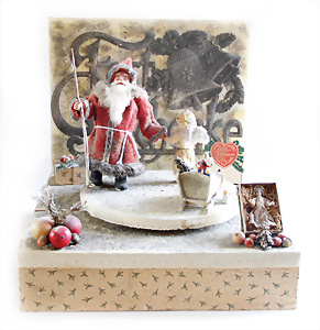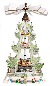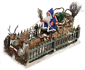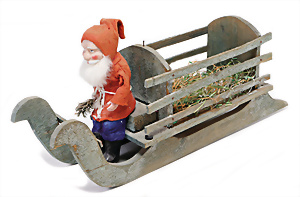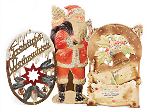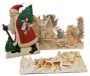 „Frohes Fest“, H: 52 cm, Weihnachtsmann auf Scheibe, Engelskind mit Porzellan-Kopf, Schlitten mit Geschenken, früher Elektro-Antrieb, intakt, dekorativ, wohl 30er Jahre
