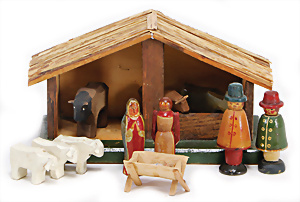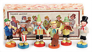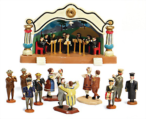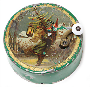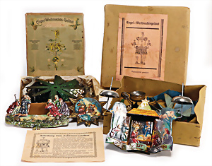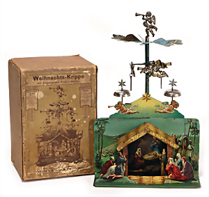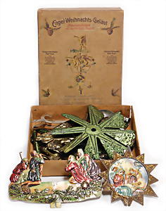 Engel- Weihnachtsgeläut " Posaunenchor mit der Geburt Christi", W. Stock, Solingen, Blech lithogr., im Orig.-Kart., ohne Anleitung, etwas angelaufen, Lithos gut, 1910