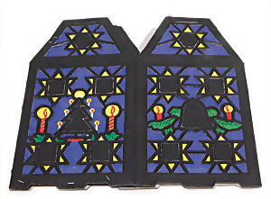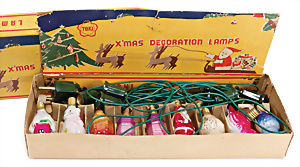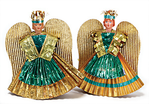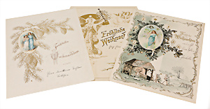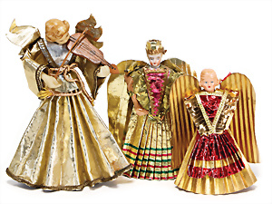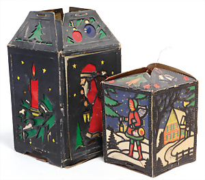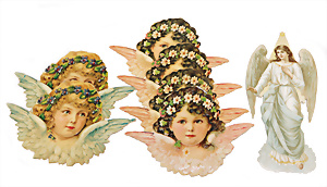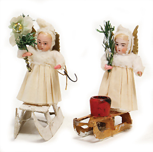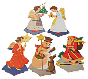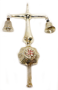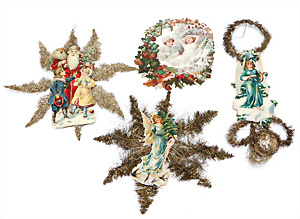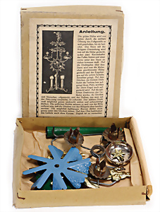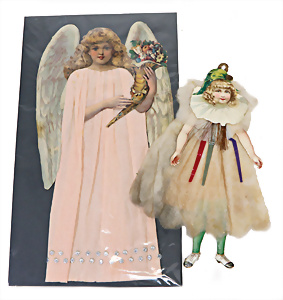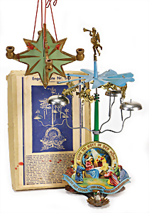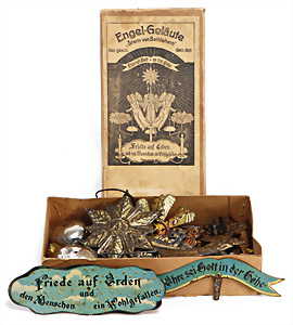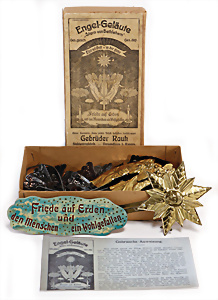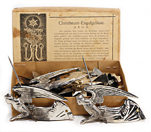 2 Teile Engel-Weihnachts-Geläut, Blech lithogr., 2 Glockensterne fehlen, ein paar Stellen Lackverlust durch Brandschäden, im Orig.-Kart., dazu Engel-Weihnachts-Geläut „Posaunenchor mit der Geburt Christi", um 1910