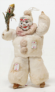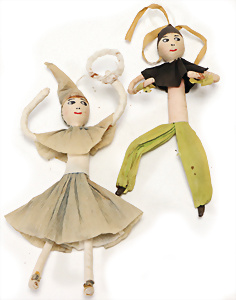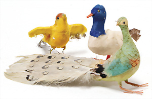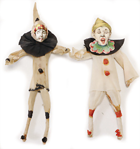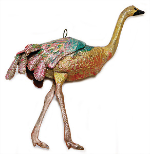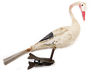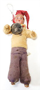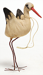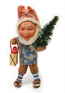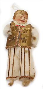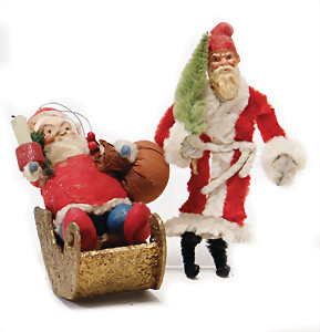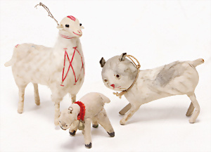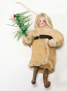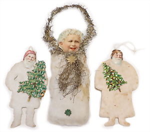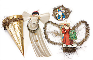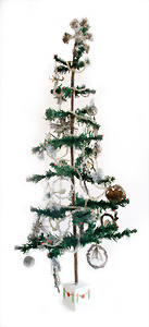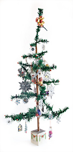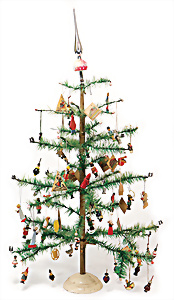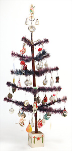 Federbaum, ca. 1920, mit bemaltem Holzständer, ca. 120 cm, ca. 28 St. Tinsel-Schmuck, z.T. mit Glas, DRESDNER PAPPE u. Watte kombiniert, Tinsel-Girlande