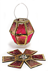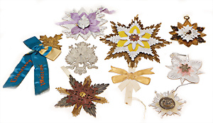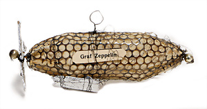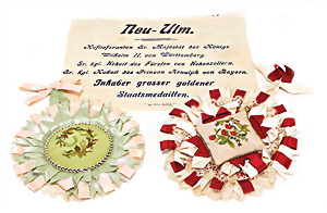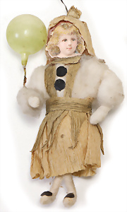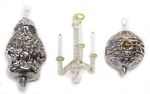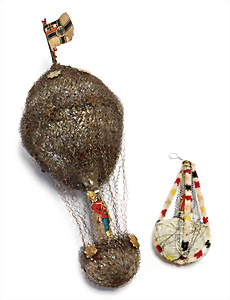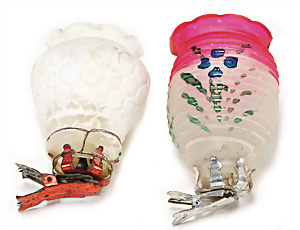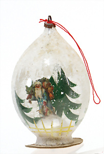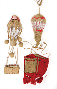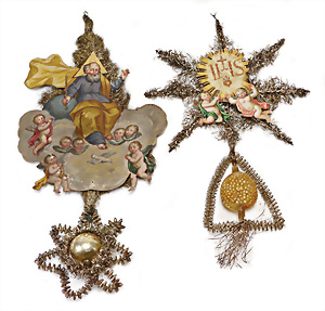 Weihnachtsschmuck, Glas, Ballon, leonische Drähte, mit Fahne u. Oblaten-Bildern, 18 cm, außergew. Gr., dazu kl. Ballon, 9 cm, leonische Drähte, Stoffbänder