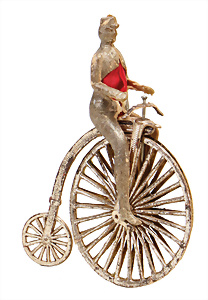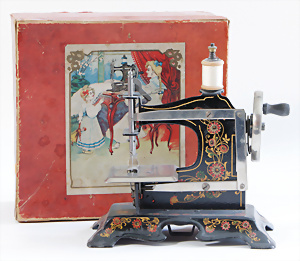 Nähmaschine, Nr. 2-1, "Mona Lisa"-Dekor, im Orig.-Kart., leicht verschlissen, sonst guter Zust., Baujahr 1912, Handnähmaschine sehr selten mit diesem Dekor, Riss im Sockel, funktionsfähig, 16 x 18 cm