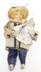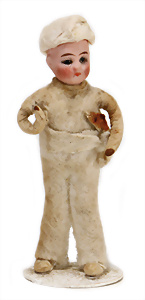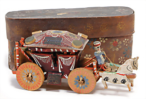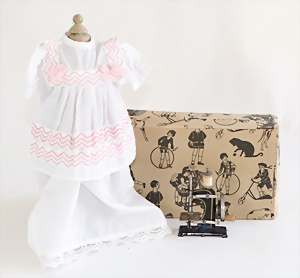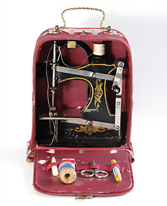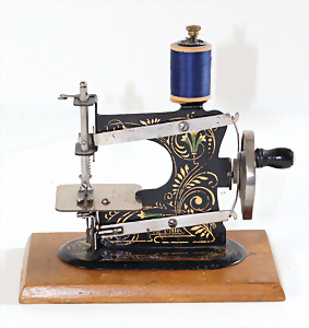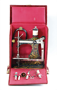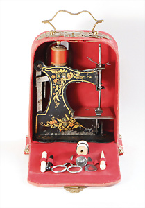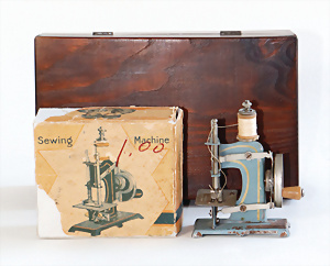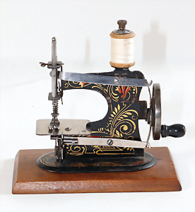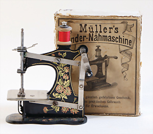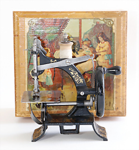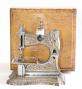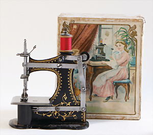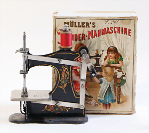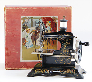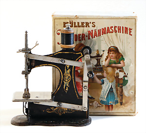 Nähmaschine, Nr.1, Obertransport, Herold, mit ELASTOLIN Figur, guter Zust., funktionsfähig, in Orig.-Samtbox, inkl. Nähzubehör, guter Zust., Baujahr 1896. aus dem Nachlass von Familie Müller, 15 x 12 cm