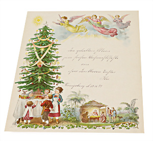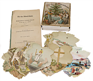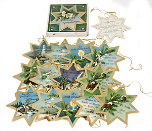 Christbaumschmuck, "Für den Adventsbaum", Pappkästchen mit 27 gestanzten u. chromolithographierten Karten in Weinblattform, mit Bibelsprüchen, Nr. 25 u. 26 als Kopie,1900, sehr selten