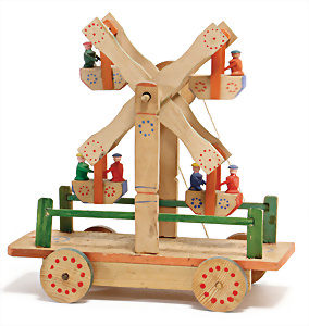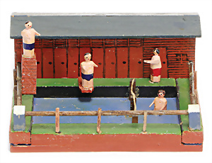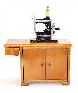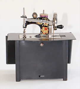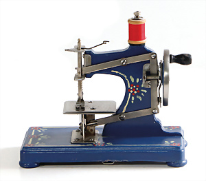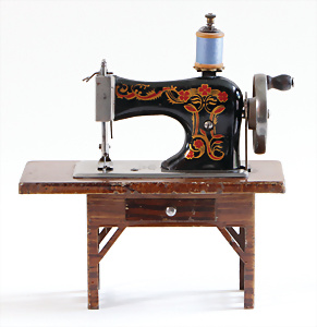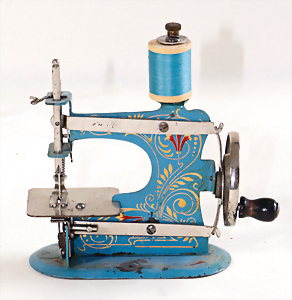 Nähmaschine, Nr. 55, blau, Blumen-Dekor, Baujahr 1938, extrem selten, vermutlich farbl. überarbeitet, guter Zust., aus Holz, funktionsfähig, 19x20 cm