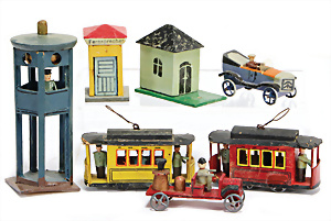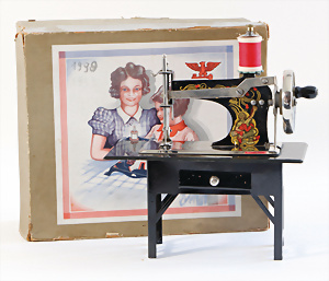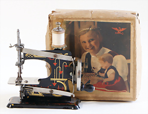 Nähmaschine, Nr. 204-1, schwarz, "das tapfere Schneiderlein"-Dekor, Baujahr 1938, selten mit dem Orig.-Zubeh., im Orig.-Kart. minim. Abriebspuren, sonst guter Zust., funktionsfähig, 18 x 18 cm