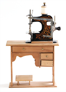 Nähmaschine, Nr. 0, auf Holztisch, Baujahr 1935, extrem selten, orig., Blumendekor, funktionsfähig, minim. Lackschäden, sonst guter Zust., 28x17 cm
