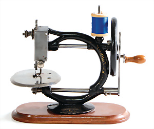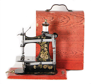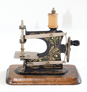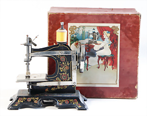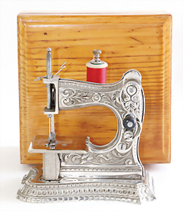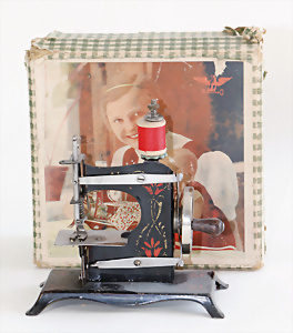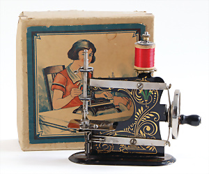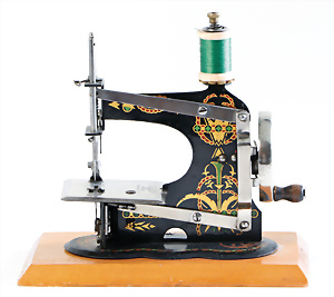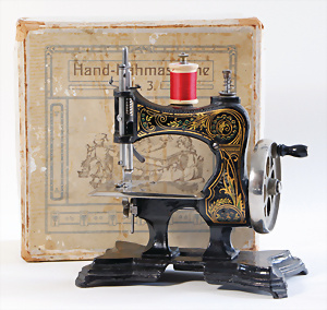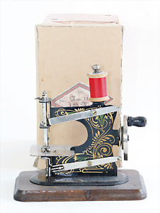 Nähmaschine, Nr.12, Sockel mit kl. Füßen, Baujahr 1920, im Orig.-Kart., mit Gebrauchsanleitung, minim. Lackschäden, sonst guter Zust., 15 x 14 cm