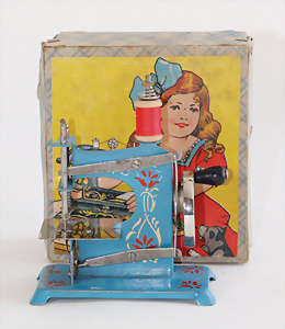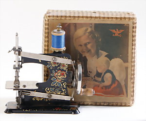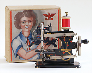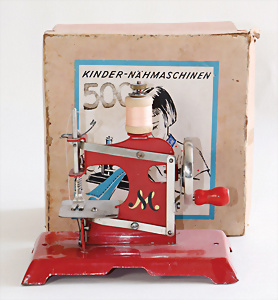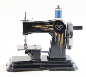 Nähmaschine, Nr.0, Rechtecksockel, geometrisches Dekor, Baujahr 1950, im Orig.-Kart., guter Zust., funktionsfähig, Made in Germany British-Zone, 15 x 12 cm