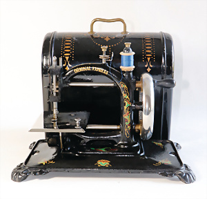 Nähmaschine, Nr.1, Obertransport, dreifarbig, Blumen-Dekor, leichte Lackschäden, funktionsfähig, Orig.-Samtbox, mit Nähzubehör, guter Zust., 13 x 10 cm, Baujahr 1896