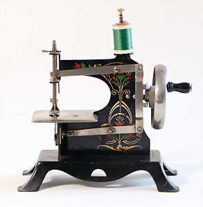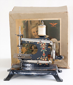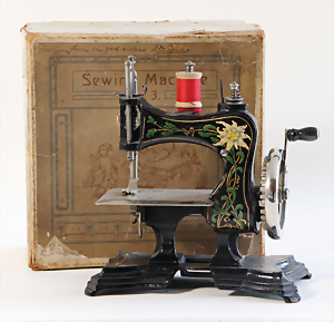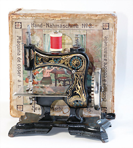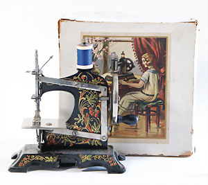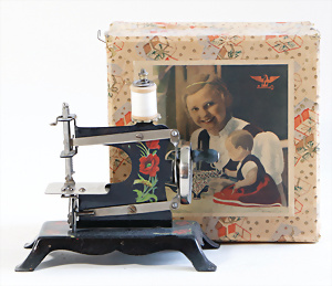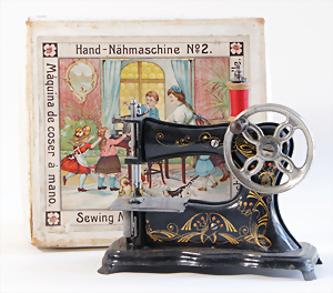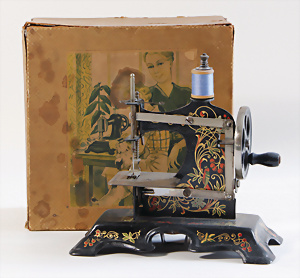 Nähmaschine, Nr. 2, mit Querstange am Gestänge, Baujahr 1930, im Orig.-Kart., Karton leicht gerissen, leichte Gebrauchsspuren, Handnähmaschine Blumen-Dekor, funktionsfähig, sonst guter Zust., 18 x 17 cm