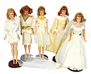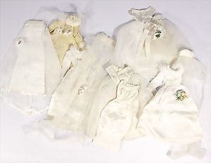 Konv. 6x Brautkleidung, nicht kompl., bespielt, darunter „Wedding Wonder“, Nr. 1849, Kleid mit Schleier, „Winter Wedding“, Nr. 1880, mit Schleier u. Mantel, „Barbie´s Dream“, u.a., nicht kompl., alle bespielt