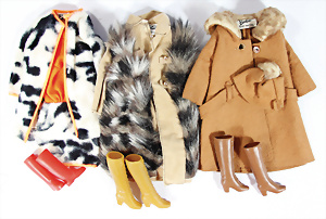 3x Barbie-Outfit, Mantel, darunter „It´s Cold Outside“, Nr. 0819, „Sued´N Fur“, Nr. 3491, Mantel, 1x Mantel mit Kleid, Stiefel ergänzt