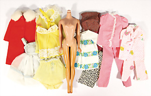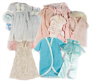 Konv. Barbie-Kleidung, teils nicht kompl., darunter Night Negligee, Nr. 965, Morgenmantel, Sleeping Pretty, Nr. 1936, Uhr ergänzt, Slumber Party, Nr. 1642, Kleinteile fehlen, u.a., alles bespielt