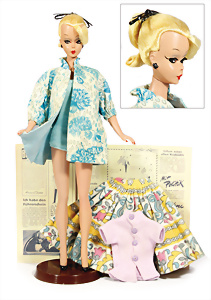 Bild-Lilli, Orig., 29 cm, blond, schöne Orig.-Frisur, schöne Bemalung, Riss an rechter Schulter, mit Orig.-Ständer, kl. Einrisse am Ständer geklebt, Plastikhülle an mehreren Stellen eingerissen, 1 Teil weggebrochen, liegt bei, Zeitung Nachdruck