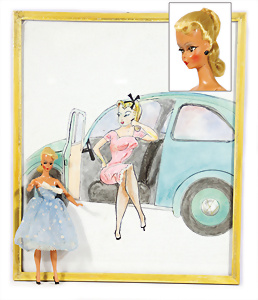 Bild-Lilli, kl. 15 cm, blonde Orig.-Frisur, Haarband fehlt, Naht an rechter Schulter aufgegangen, Hände ergänzt, Kleidung nachgenäht