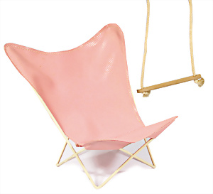 Bild-Lilli-Sessel, Drahtgeflecht mit Vinylbezug in rose, Gesamthöhe 14 cm, dazu 1 Schaukel mit Holzstange