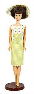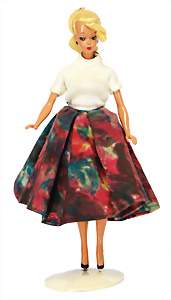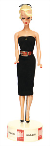 Bild-Lilli, kl. 15 cm, schöne Orig.-Frisur mit Stirnlocke, Haarband ergänzt, Orig.-Pulli, Rock nachgenäht, mit Orig.-Ständer