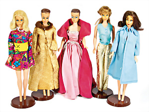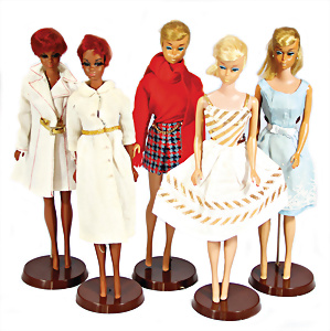 5 Puppen, 2x Julia,1x Riss am Hals u. Verfärbung an den Ohrlöchern, 3x Swirl Ponytail-Barbie, Straight-Leg, blond, stärker bespielt, Verfärbungen an den Ohren, bzw. Einrissstellen an den Köpfen, Orig.-Outfits nicht kompl.
