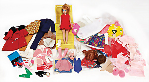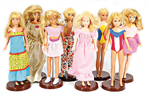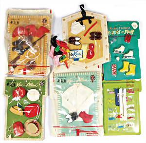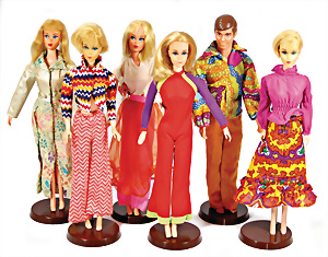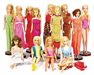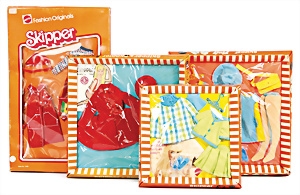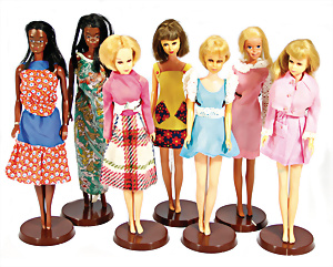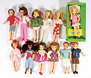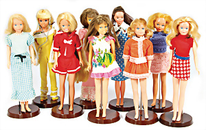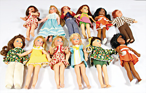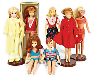 Konv. 7 Puppen, 5x Skipper, 1x Scooter u. 1x Ricky, alle bespielt, in Orig.-Kleidung nicht kompl., dazu 1x Orig.-Kart.