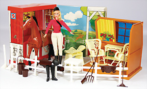 Barbie Pferd mit Koffer, dazu 1 Barbie Puppe u. etwas Mobiliar von 1976, auf Vollständigkeit nicht überprüft