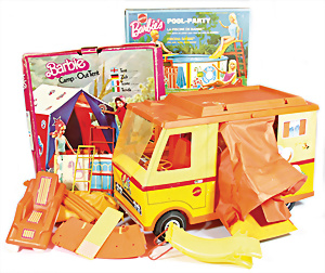 Barbie „Country Camper“, stark bespielt, angeschmutzt, Frontscheibe gebrochen, dazu einige Teile Outdoor-Möbel, Swimming-Pool, 1 Camping-Zelt, auf Vollständigkeit nicht überprüft, Zelt stark bespielt u. angeschmutzt
