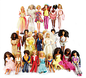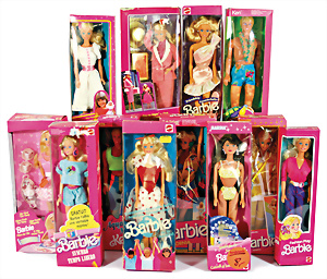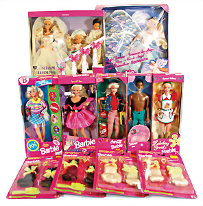 Konv. 5x Barbie, 3x TNT, stärker bespielt, 2x Einrissstelle am Hals, dazu 2x Fashion-Queen, 1x Verfärbungen an den Ohren, alle in Orig.-Outfit, nicht kompl.
