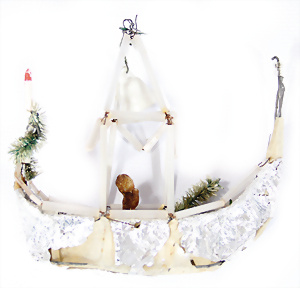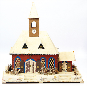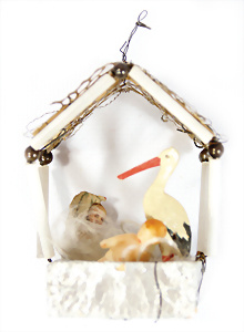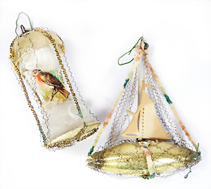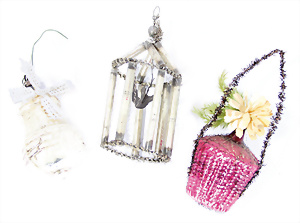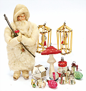 Weihnachtsschmuck, Fundkiste, kl. Teile Spiegelglas, Weihnachtsmann, Watte, Oblatengesicht, 20 cm, Watte-Pilz, 2 Vogelkäfige, LAUSCHA