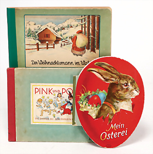 Konv. Bücher, "Pink & Ponk, die Zwerge bei den Engelen im Himmel", Weihnachtsmärchen von Doris Berlich, ca. 1920, bunt illustriert, Zust. 2-3, "Der Weihnachtsmann im Walde", 1943, "Mein Osterei", Osterbilderbuch in Ei-Form