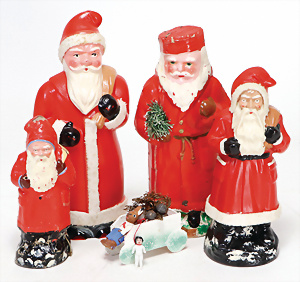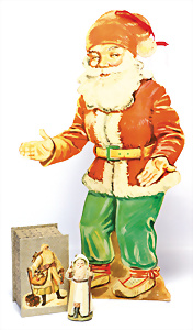 Konv. Papiermaché, Weihnachtsmänner, 17,5 u. 27 cm, 2 Weihnachtsmänner Kunststoff, 1 Masse-Osterhase mit Wagen