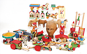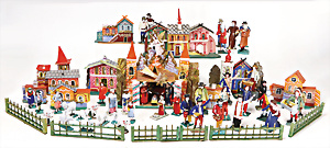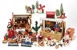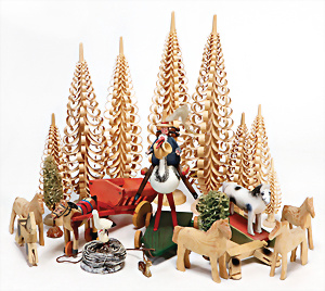 Konv. Holzspielzeug, ERZGEBIRGE u.a., untersch. Zeit, Hühnerwagen, pickende Hühner, Schaukelpferd, einige Luffabäume, 1 Dorf Pappe, Holz/Masse