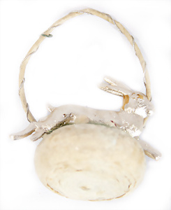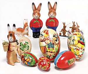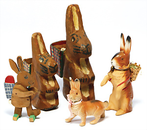 Konv. Ostern, 5 Ostereier, davon 1x bemalt, sonst Chromolithographie, 4 Masse-Osterhasen, 1x mit Kiepe, 1 Fuß geklebt