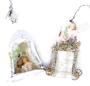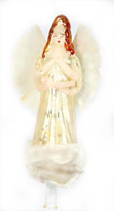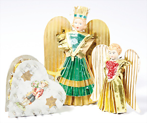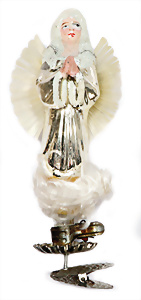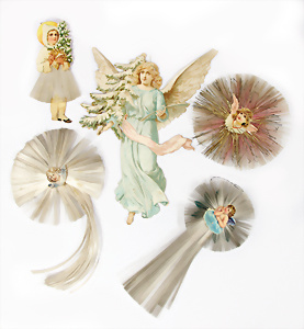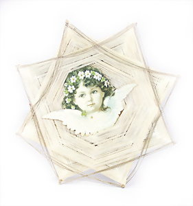 Konv. Weihnachtsschmuck, 4 Teile, Oblatenbild mit Engelshaar, Mädchen Fehlstelle am Fuß, H: Engel 20,5 cm