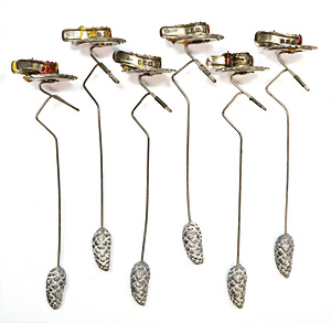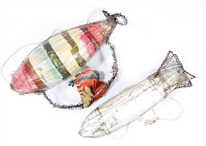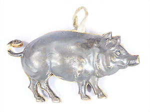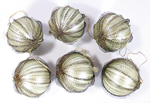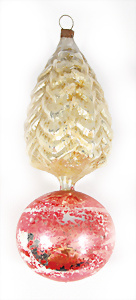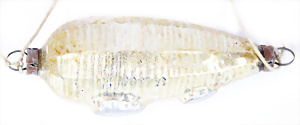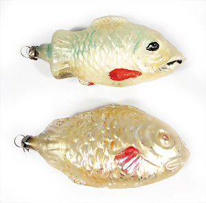 Christbaumschmuck, 6 Teile, Glas, Flasche Champagner, Fisch, Weihnachtsmann, Birne, Kugel mit mit leonischen Drähten u. Papierschrift