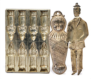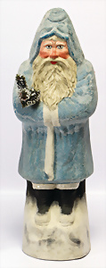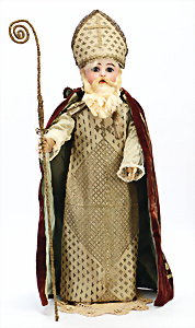 Biskuit-Porzellankopf-Puppe, gem. 3, 48 cm, Biskuit-Kurbelkopf, blaue fest eingesetzte Glasaugen, off. Mund, oben Zähne, Masse-Stehkörper, aufwendig gekleidet als St. Nikolaus mit aufgeklebtem Bart, Perücke wurde nicht entfernt