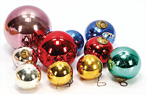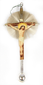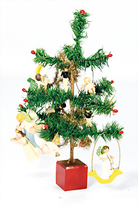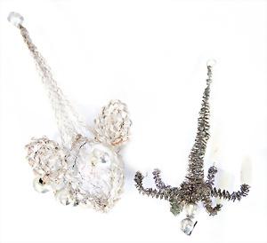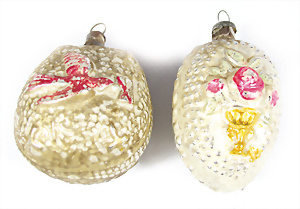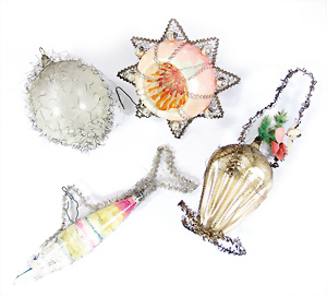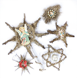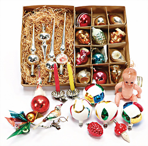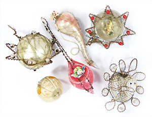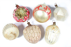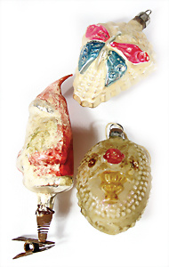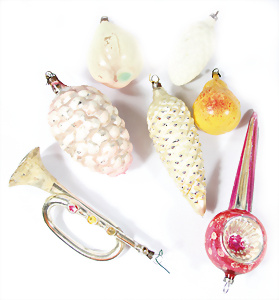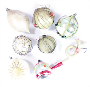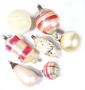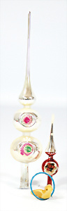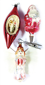 Weihnachtsschmuck, Spiegelglas, älter u. neuer, 19 Teile, Kerzenhalter, Pilz, Milchglas, 1 Celluloid-Puppe, 4 Spitzen