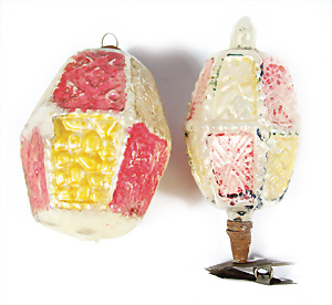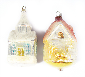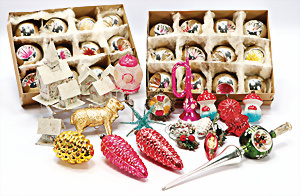 Konv. Weihnachtsschmuck, älter u. jünger, Papphäuschen mit Glimmer, 1 Weihnachtsspitze, Zapfen, Trompeten, 1 Schaf Pappe, 11 cm, 24 Reflexkugeln