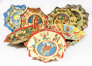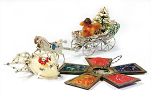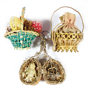 3 Teile Christbaumschmuck, Korb mit Früchten, 1 Korb Messingblech vergoldet, Candy-Container, Nuss mit Jesuskind