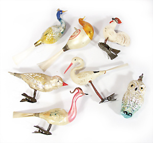 Konv. Christbaumschmuck, 6 Teile Glas, Vögel, teilw. mit Klammer, mit Glasschweif, 1 Hahn Masse mit Klammer