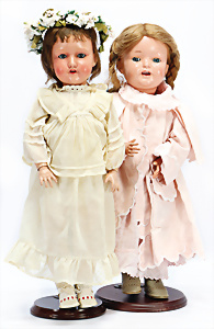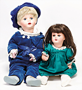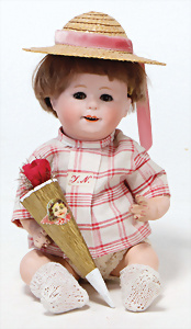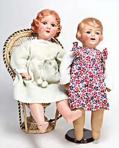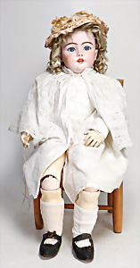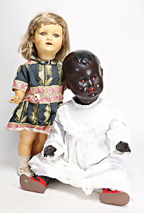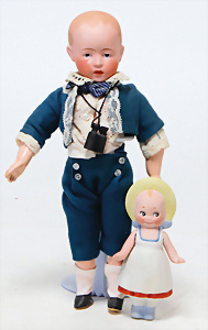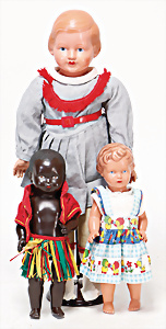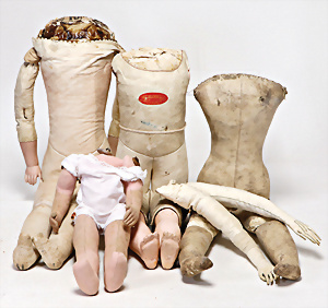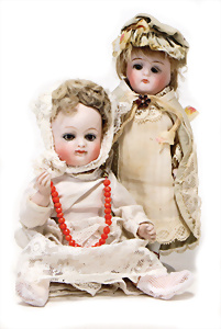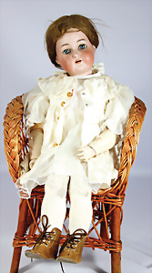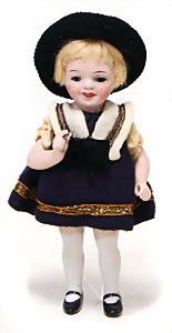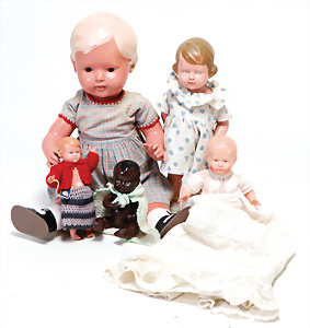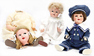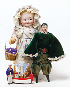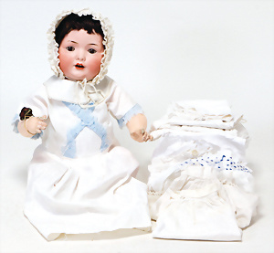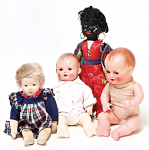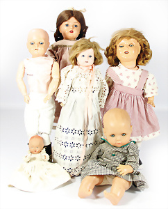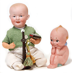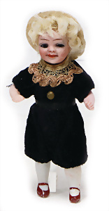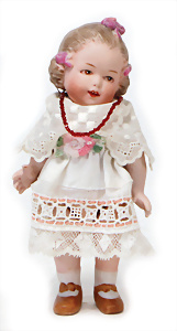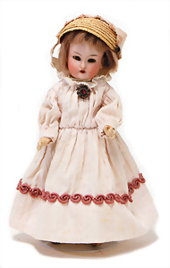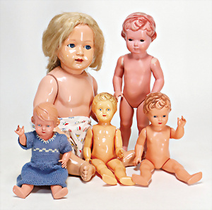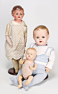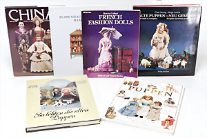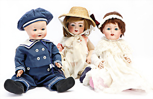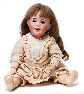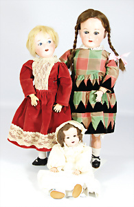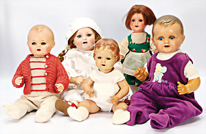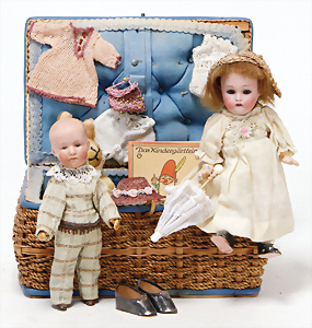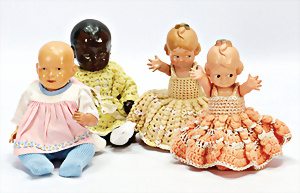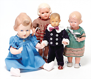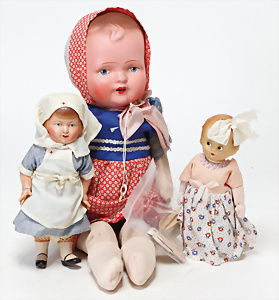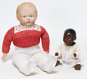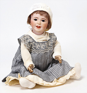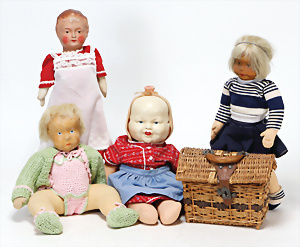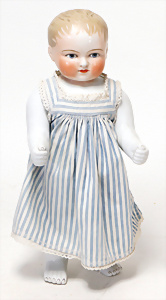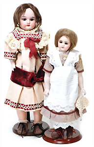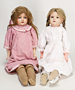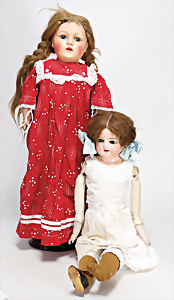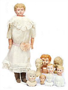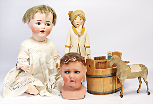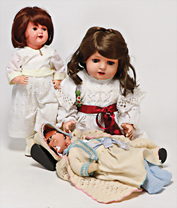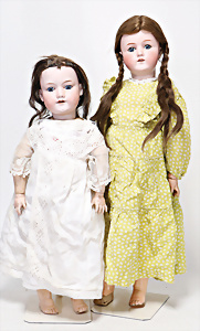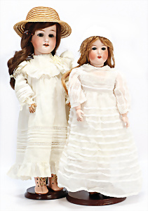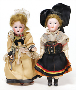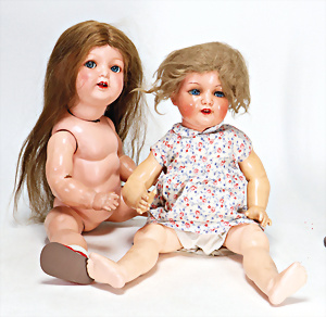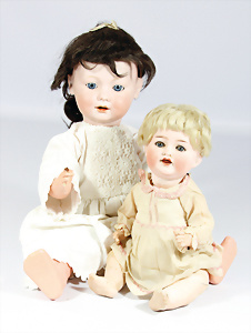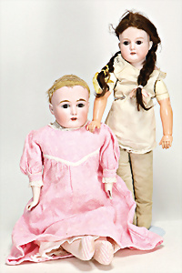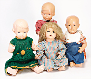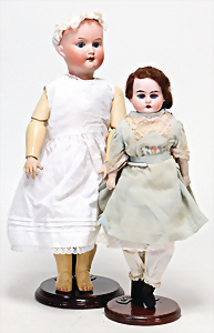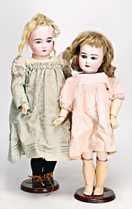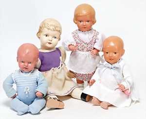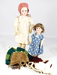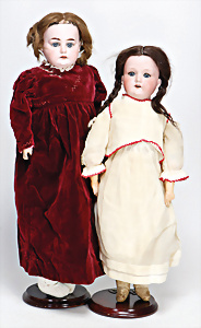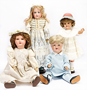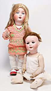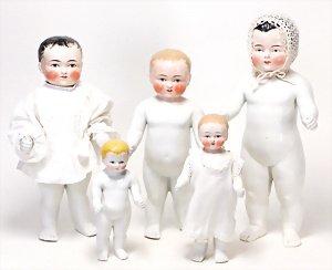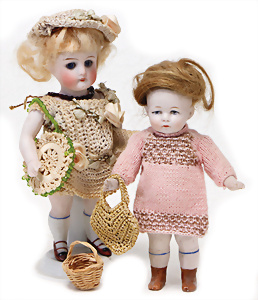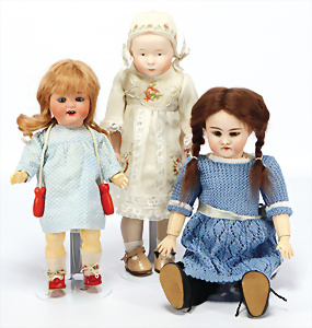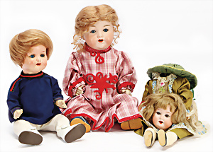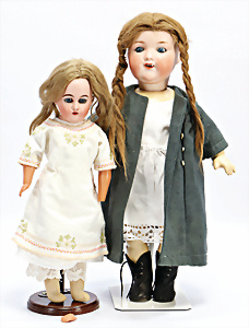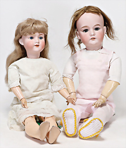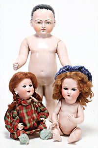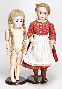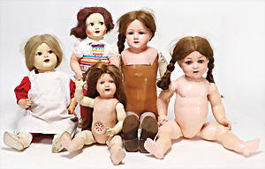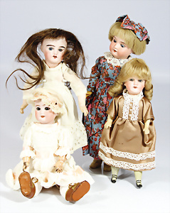 4 Porzellankopf-Puppen, ungem., fest eingesetzte blaue Glasaugen, off. Mund, Zähne, auf Masse-Stehkörper, 29 cm, ohne Perücke, 1x gem. DEP, braune Schlafaugen, off. Mund, Zähne, durchst. Ohren, Echthaar-Perücke, Masse-Gliederkörper, stärker bespielt, Farbabrieb an den Händen, 27 cm, 1x gem. GEBR. KÜHNLENZ, blaue fest eingesetzte Glasaugen, off. Mund, Zähne, Masse-Stehkörper mit anmodell. Schuhen u. Strümpfen, ohne Perücke, 24 cm, 1x AM 390, blaue Schlafaugen, off. Mund, Zähne, Echthaar-Perücke, Masse-Stehkörper, 30 cm