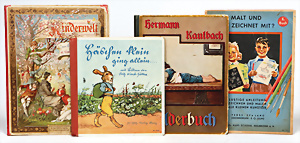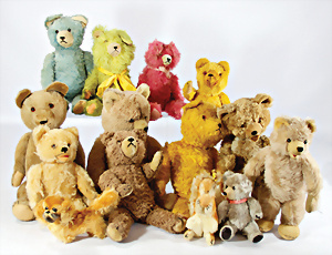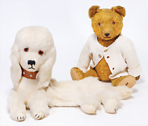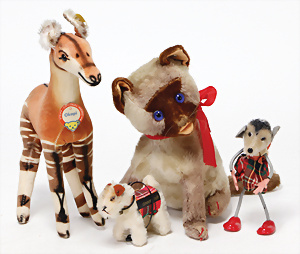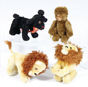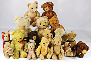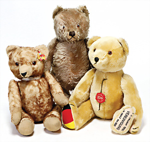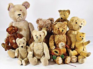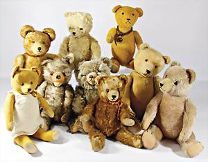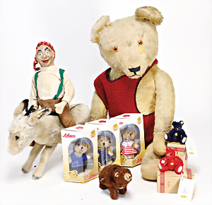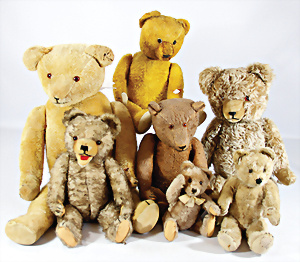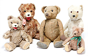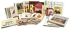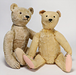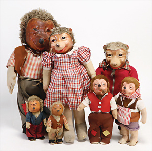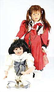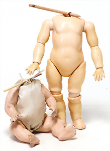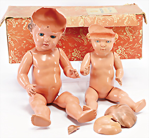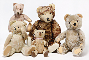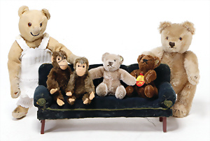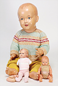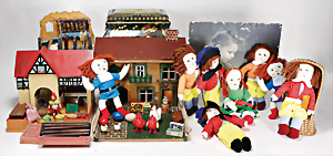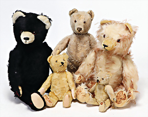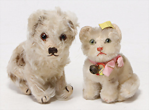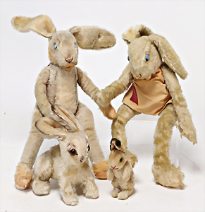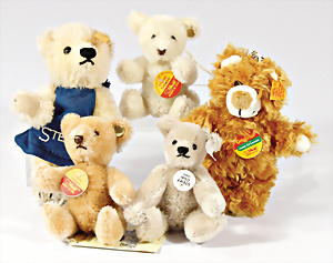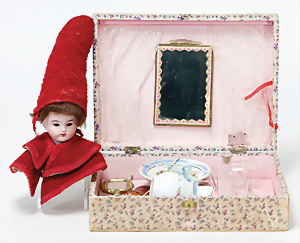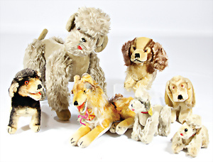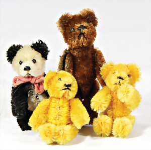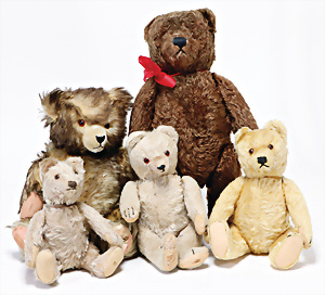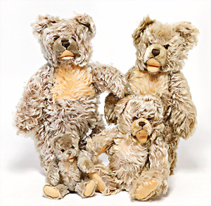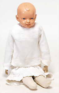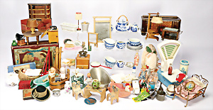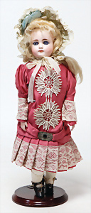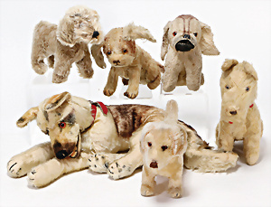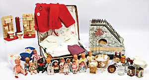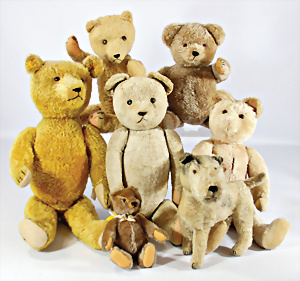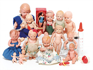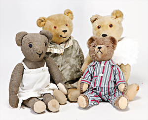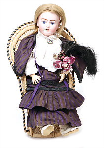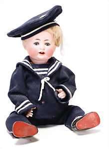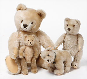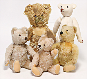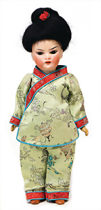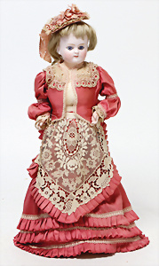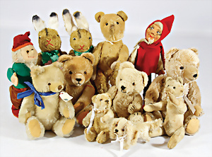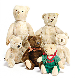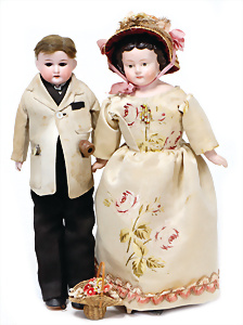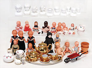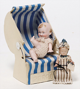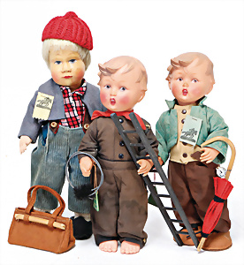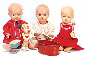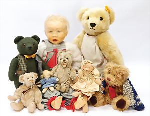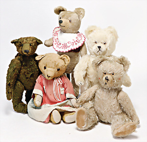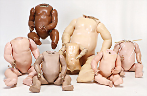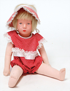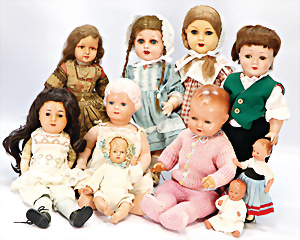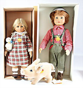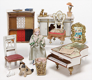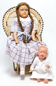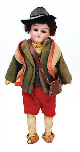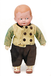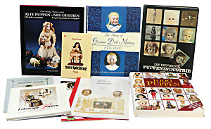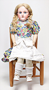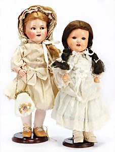 4 Porzellankopf-Puppen, ungem., fest eingesetzte blaue Glasaugen, off. Mund, Zähne, auf Masse-Stehkörper, 29 cm, ohne Perücke, 1x gem. DEP, braune Schlafaugen, off. Mund, Zähne, durchst. Ohren, Echthaar-Perücke, Masse-Gliederkörper, stärker bespielt, Farbabrieb an den Händen, 27 cm, 1x gem. GEBR. KÜHNLENZ, blaue fest eingesetzte Glasaugen, off. Mund, Zähne, Masse-Stehkörper mit anmodell. Schuhen u. Strümpfen, ohne Perücke, 24 cm, 1x AM 390, blaue Schlafaugen, off. Mund, Zähne, Echthaar-Perücke, Masse-Stehkörper, 30 cm
