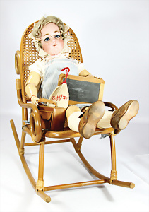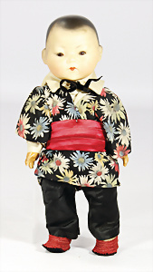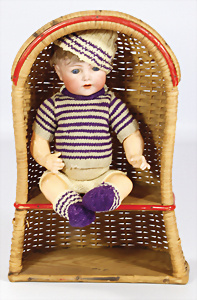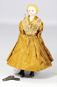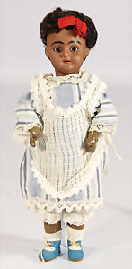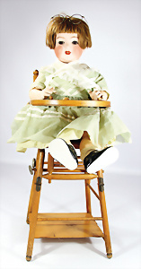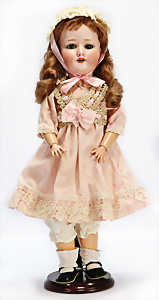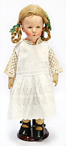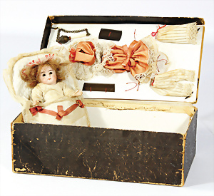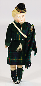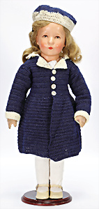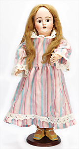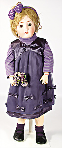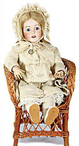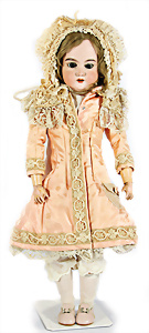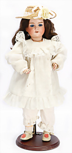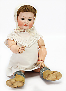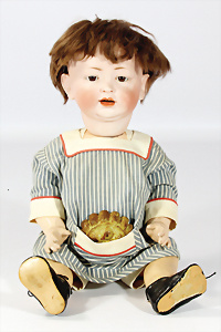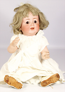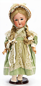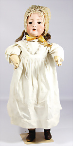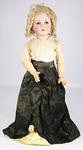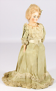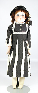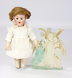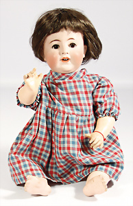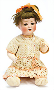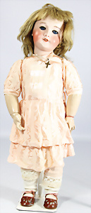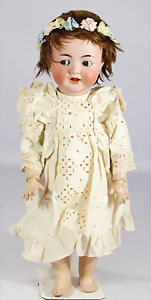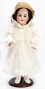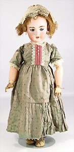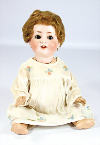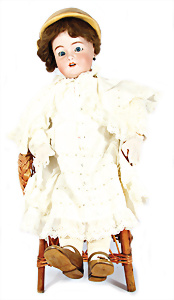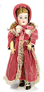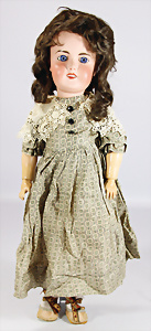 Porzellankopf-Puppe, gem. Nr. 5, braune Schlafaugen, off. Mund, Zähne, durchst. Ohren, Mohair-Perücke fest aufgeklebt, Korkdeckel, von außen keine Risse erkennbar, bitte Transportrisiko für den Augenmechanismus beachten, auf Masse-Gliederkörper, 67 cm, Kleidung nachgenäht