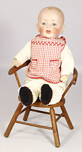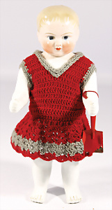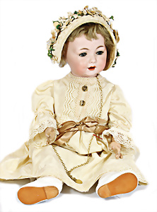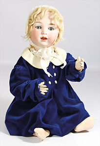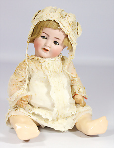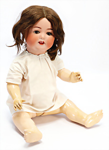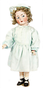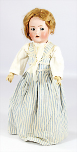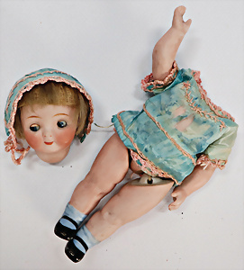 Porzellan-Kopf-Puppe, gem. Germany 10 G.327.B, kl. Brandfehler auf der Stirn, davon keine Risse ausgehend, blaue Schlafaugen, off. Mund, 2 Zähne oben, Zunge, Echthaar-Perücke, auf Masse-Toddler-Körper, 1 Finger geklebt, 53 cm, Kleidung nachgenäht