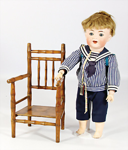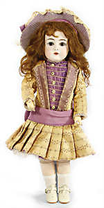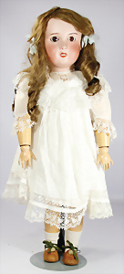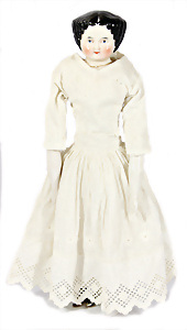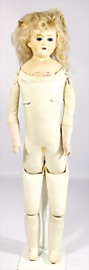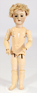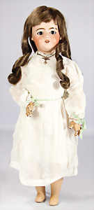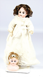 Porzellan-Brustblattkopf-Puppe, gem. 8/148, braune Schlafaugen, off. Mund, Zähne, Gipsdeckel, von außen keine Risse erkennbar, bitte Transportrisiko für den Augenmechanismus beachten, Mohair-Perücke, auf Lederkörper, Masse-Arme, 49 cm, Kleidung nachgenäht, 49 cm, Kleidung nachgenäht