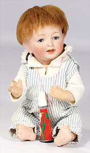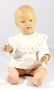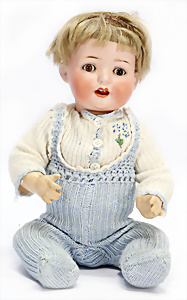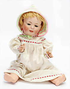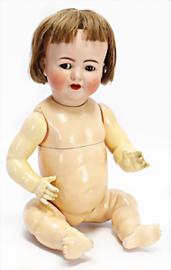 gem. 121RA Germany, blaue fest eingesetzte Glasaugen, off. Mund, Zähne, Kunsthaar- Perücke, Masse-Sitzbaby-Körper, stärker bespielt, Fußspitzen bestoßen, 20 cm