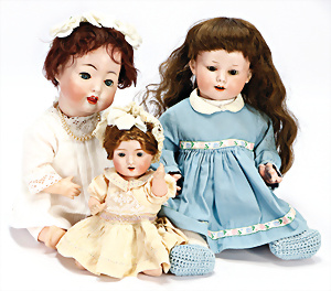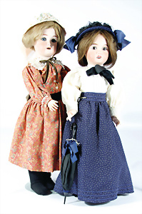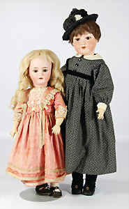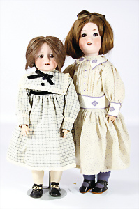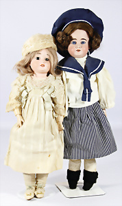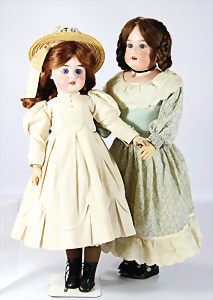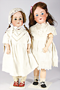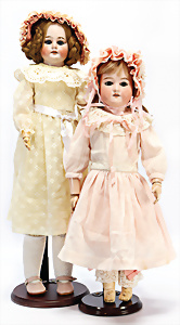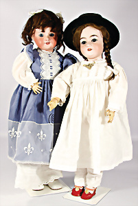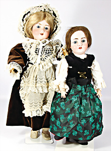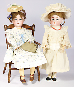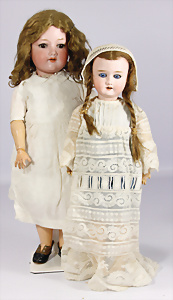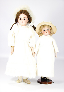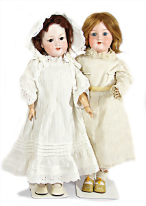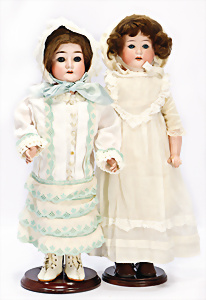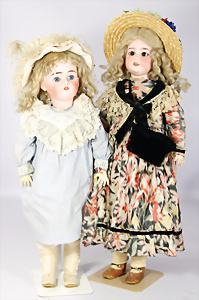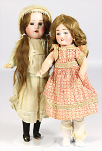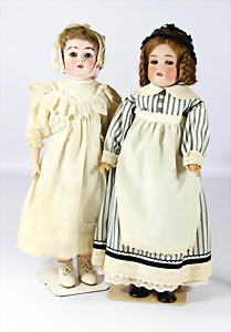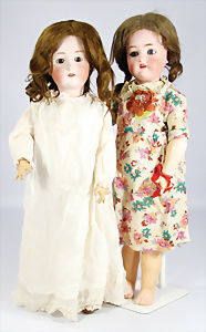 2 Porzellankopf-Puppen, 1x gem. 390, blaue fest eingesetzte Glasaugen, off. Mund, Zähne fehlen, Echthaar-Perücke, auf Masse-Gliederkörper, 56 cm, 1x gem. 390N, braune Schlafaugen, off. Mund, Zähne, Mohair-Perücke, auf Masse-Gliederkörper, 54 cm, Kleidung alt oder aus alten Stoffen nachgenäht