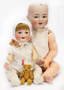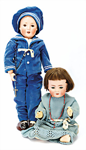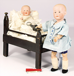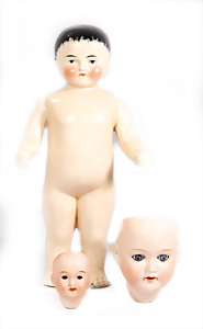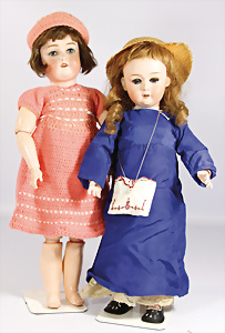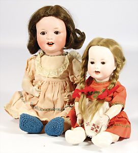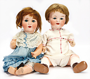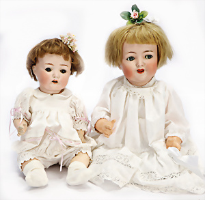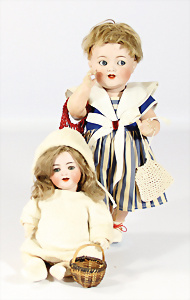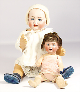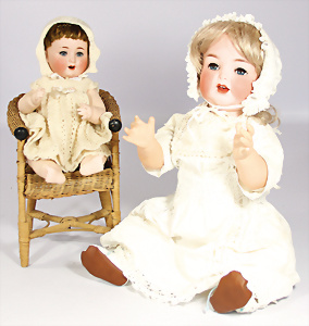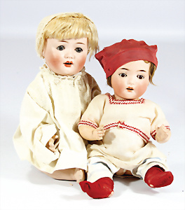 2 Porzellankopf-Puppen, 1x gem. Germany 990 A.7M, blaue Schlafaugen off. Mund, 2 Zähne oben, Echthaar-Perücke, Masse-Sitzbaby-Körper mit leicht abstehendem Zeh, Hände berieben, 44 cm, 1x gem. 995 A.6.M., blaue Schlafaugen off. Mund, 2 Zähne oben, Zunge, Echthaar-Perücke, auf Masse-Sitzbaby-Körper, Körper stärker bespielt, Arme überstrichen, 42 cm
