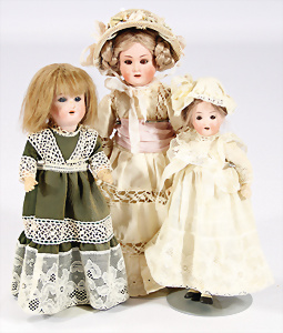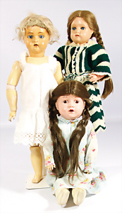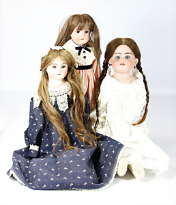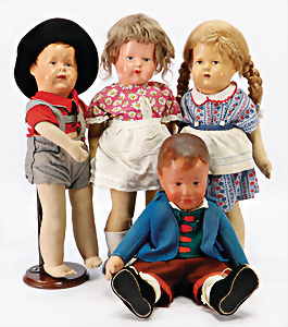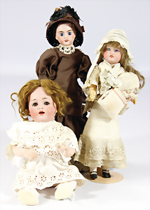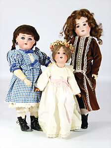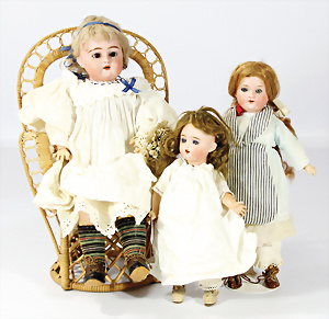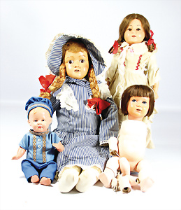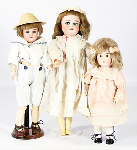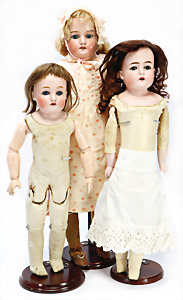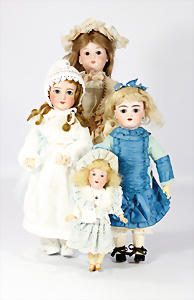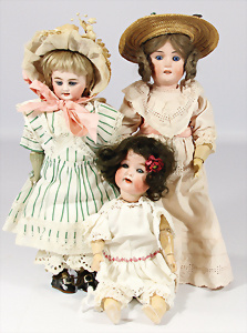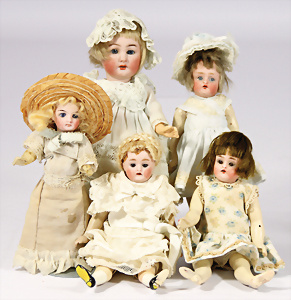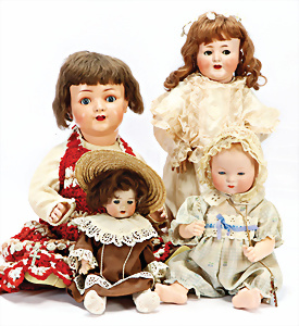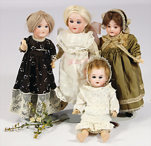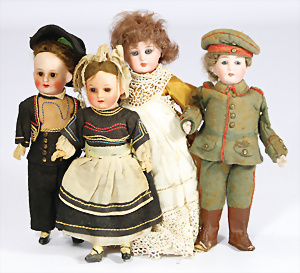 4 Porzellankopf-Puppen, 1x gem. SFBJ 301 Paris, blaue Schlafaugen (Augenmechanismus sitzt schief), off. Mund, Zähne, durchst. Ohren, kl. Chip am rechten u. linken Ohr, Mohair-Perücke fest aufgeklebt auf Masse-Gliederkörper, 40 cm, 1x gem. 109/5 DEP H, braune Schlafaugen, off. Mund, Zähne, durchst. Ohren, Mohair-Perücke auf Masse-Gliederkörper, Körper überstrichen, 37 cm, Kleidung teilw. alt oder aus alten Stoffen nachgenäht, 1x gem. Germany C.0, braune Schlafaugen, off. Mund, Zähne, Echthaar-Perücke, Masse-Gliederkörper, 38 cm, Körper überstrichen, 1x gem. W. Germany 10, blaue fest eingesetzte Glasaugen off. Mund, Zähne, kl. Brandfehler über der Nase, Mohair-Perücke, Masse-Stehkörper mit anmodell. Schuhen u. Strümpfen, 22 cm