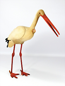 Storch Adebar, mit Knopf, Schild u. Fahne, Nr. 1166 mit Fähnchen Made in US-Zone Germany, H: 56 cm, etwas angeschmutzt